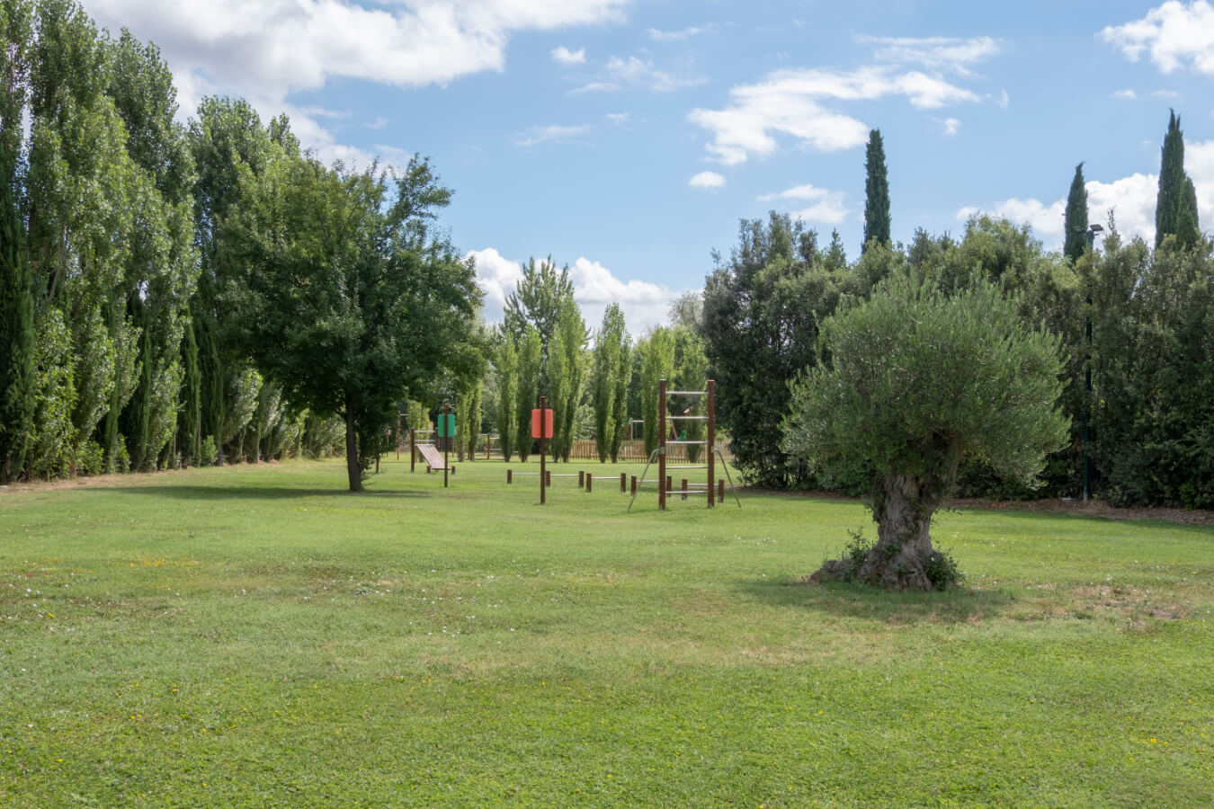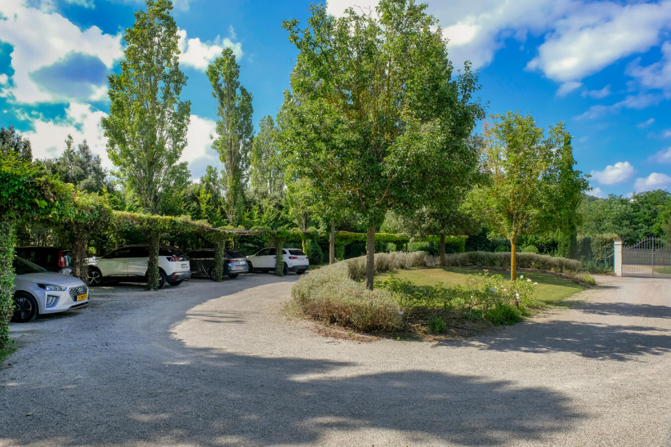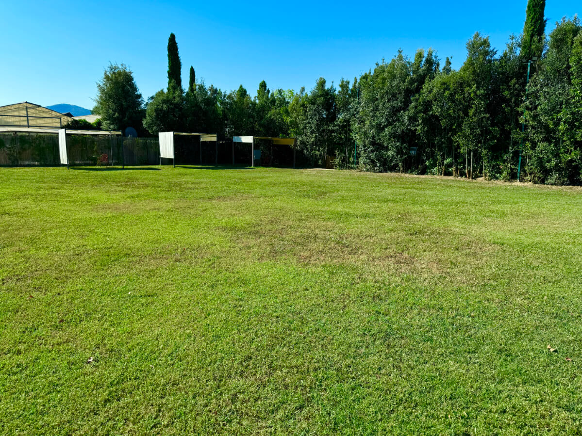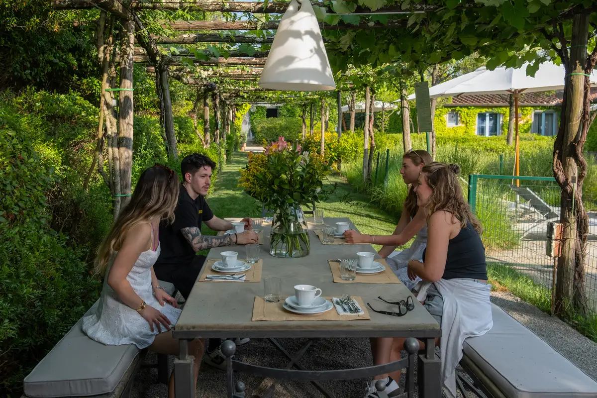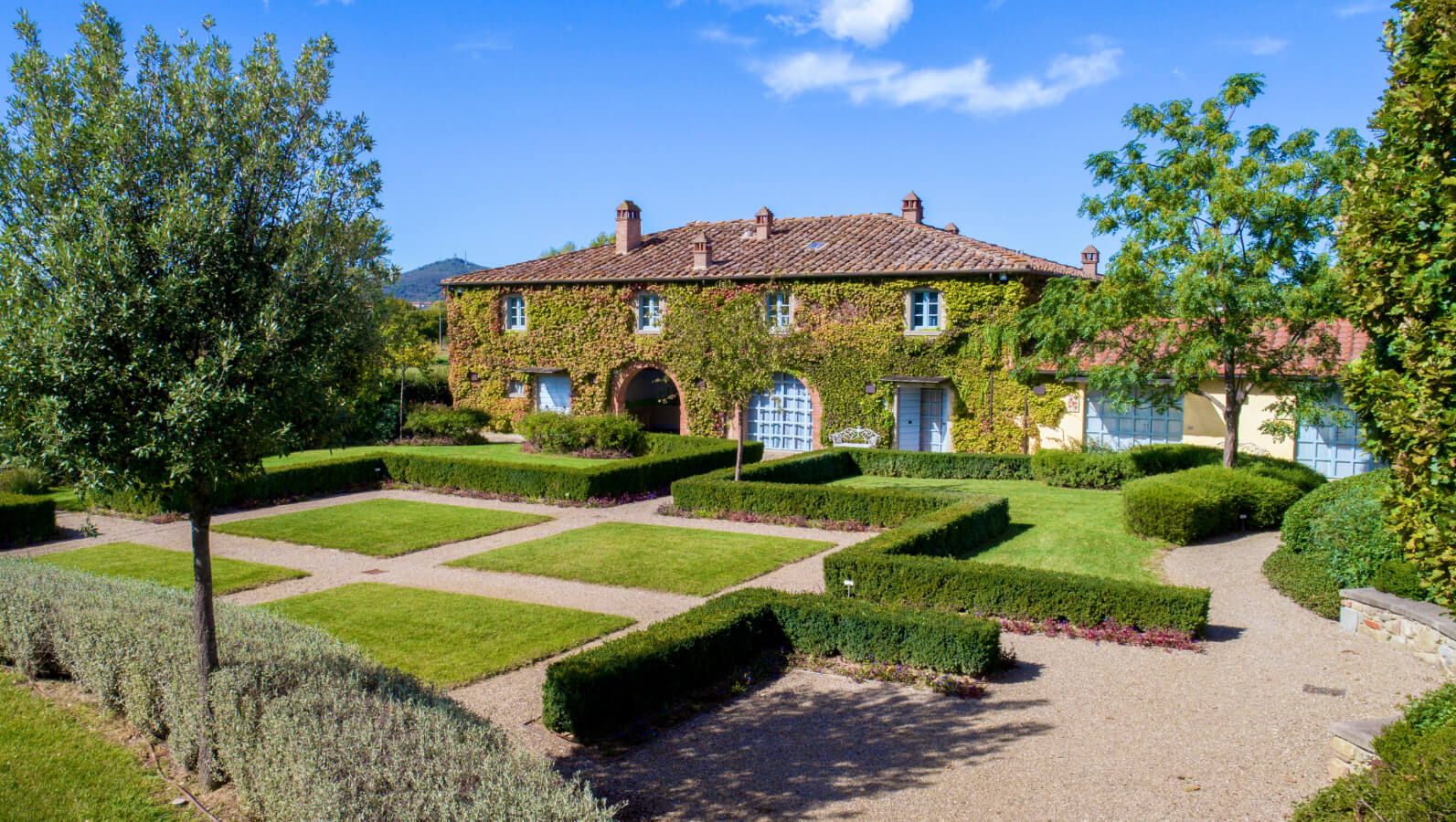 L’armoniosa facciata della Residenza, coperta di “Ampelopsis Brevipedunculata”, si affaccia sul giardino ispirato al classico stile toscano. Sul lato opposto si trova il parcheggio semicircolare coperto di rampicanti. Sul lato posteriore si trovano la piscina, il solarium in pietra serena, il barbecue, il lungo pergolato di rose e viti e il gazebo per le colazioni e le cene estive. Vicino al parcheggio, sono collocati la Reception e lo Spazio Eventi. Da qui si accede al Vivaio/Garden di fiori e piante della flora mediterranea che costituisce l’attività prevalente dell’Azienda Agrituristica.